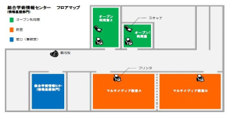 マルチメディア教室は,A教室(65席)・B教室(65席)あります。この教室は,授業等を優先的に使用しておりますので,授業以外で任意で使用される場合は,情報基盤の窓口の掲示でご確認ください。