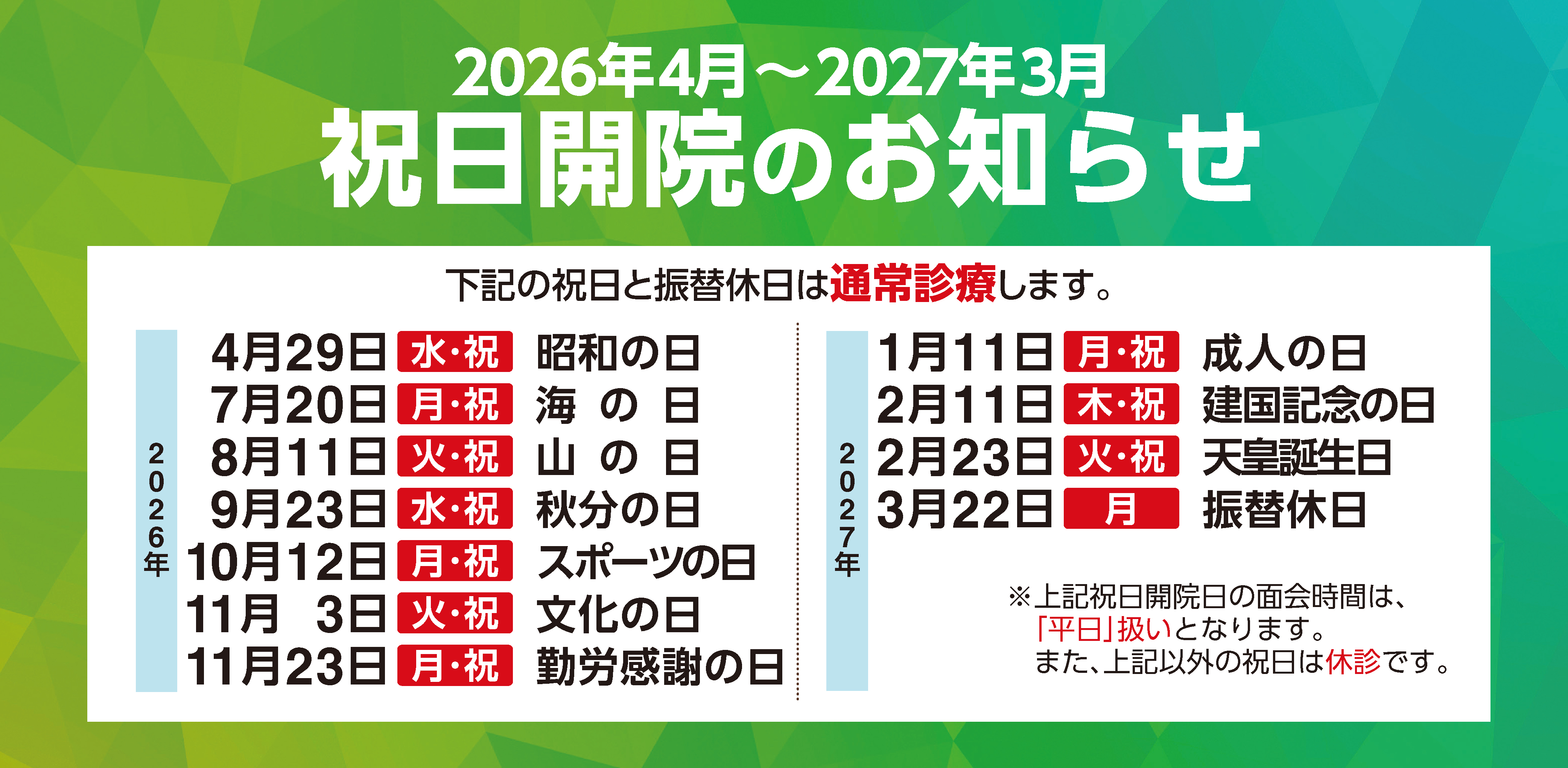 ※祝日開院日は平日扱いとなります。