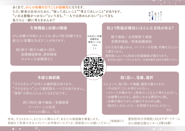 AYAサポートチームでは,病気以外にもさまざまな問題を抱えるAYA世代の患者さんが少しでも快適に治療が受けられるように,治療後の生活が不安なく快適に送れるようなお手伝いをしています。例えば,抗がん剤の副作用がつらいときは副作用軽減のアドバイスをします。学生さんが入院したときは学校の授業にzoomを利用して参加でき単位取得できるように学校と交渉もします。社会人であれば休業時の手当の申請のお手伝い,復職時に職場と調整などをしています。ほかに,手術のきず,抗がん剤による脱毛など見た目の相談(アピアランスケアといいます)など,いろいろな問題に対応しています。
