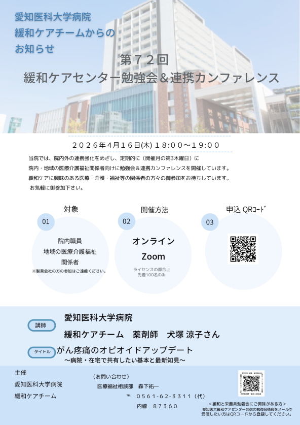 愛知医科大学病院で外来通院,あるいは入院加療されている患者さんに,質の高い緩和ケアを提供する部門として,緩和ケアセンターが設置されました。当センターでは,がんをはじめとする難治性疾患で療養されている患者さんとその御家族の直面する多くのつらい症状に,緩和医療専門医をはじめ,多くの職種が協働し,緩和できるよう取り組んでまいります。