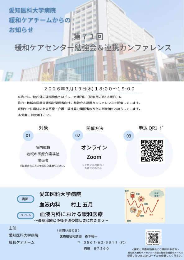 愛知医科大学病院で外来通院,あるいは入院加療されている患者さんに,質の高い緩和ケアを提供する部門として,緩和ケアセンターが設置されました。当センターでは,がんをはじめとする難治性疾患で療養されている患者さんとその御家族の直面する多くのつらい症状に,緩和医療専門医をはじめ,多くの職種が協働し,緩和できるよう取り組んでまいります。