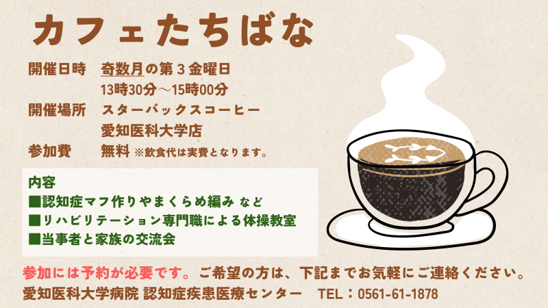 当院では,2026年1月16日(金)に認知症カフェ「カフェたちばな」を開催します。認知症に関する悩みごとや情報交換など,当院専門職を交えてお話しませんか。認知症の人やその家族だけでなく,どなたでも自由に参加いただけますので,お気軽にご参加ください。