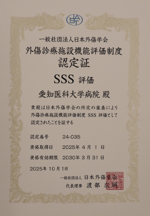 このたび当院は,一般社団法人日本外傷学会による外傷診療施設機能評価を受審した結果,最高評価であるSSS評価(全国で12施設)に認定されました。認定期間は,令和7年4月1日から令和12年3月31日までの5年間です。