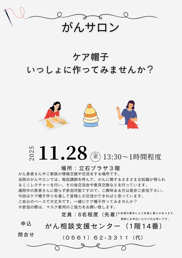 - 詳しくは,がん相談支援センターにお問い合わせいただくか,院内の掲示や病院のホームページをご覧ください。