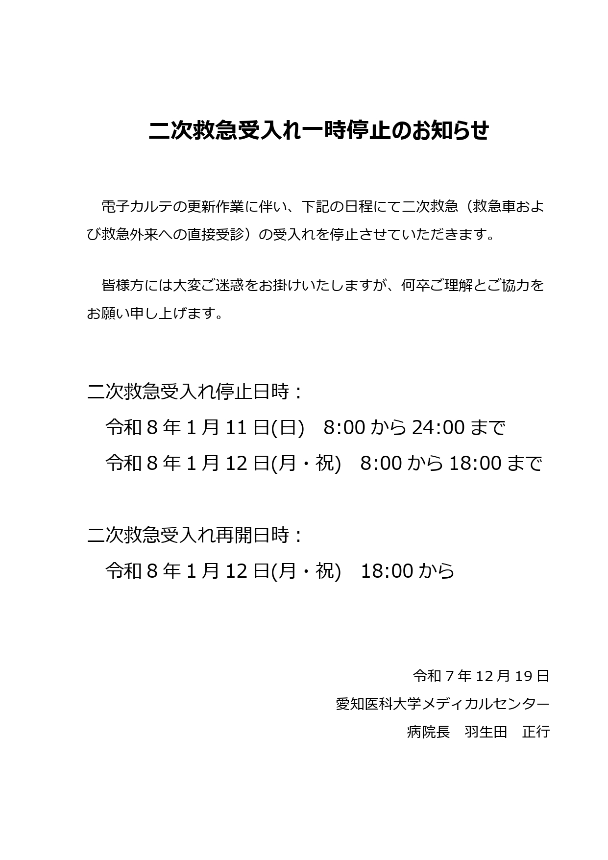 二次救急受入れ停止日時: 令和8年1月11日(日) 8:00 から 24 :00 まで,令和8年1月12日(月・祝)8:00~18:00まで