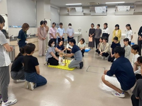 当日は,こどもの体の特徴,熱中症の特徴と対応,頭部・口腔内の怪我と初期対応,受診するサインについて講義を行い,その後参加者がグループに分かれて幼児モデルに対して,頭部の出血に対するストッキングを用いた圧迫包帯止血法の技術演習を行いました。参加者からは,「『眠い』『疲れた』という言葉が熱中症のサインかもしれないということを初めて知った」「冷却ジェルシートは体を冷やす効果がないことを初めて知った」「1人ではなく2~3人で、子どもに声をかけ安心させながら行うことが大切だと感じた」「一般の家庭にあるものがこのような形で利用できることを知り、災害の際にも役に立つと思った」という感想が寄せられました。