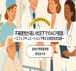 令和7年10月25日(土)に,杏林大学保健学部・角田ますみ准教授による「不確実性が高い状況下でのACP(アドバンス・ケア・プランニング)実践 -エフェクチュエーションで考える意思決定支援-」をオンライン形式で開催し,県内外から57名の参加がありました。