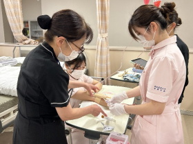 学生からは,「臨床現場をイメージできた」「実際に病棟で使用している物品と同じ形状のものを使えることは貴重な経験となった」「患者への配慮も考えたコツを教えてもらえた」などの感想が聞かれました。