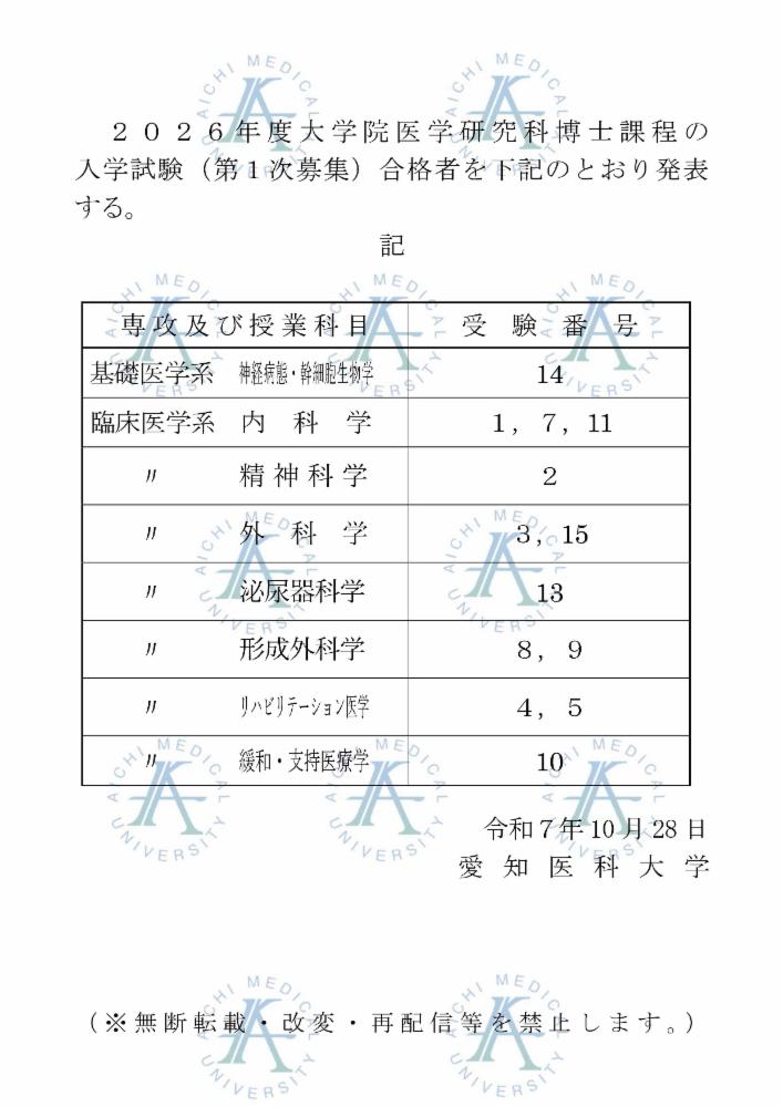 2026年度大学院医学研究科入学試験(第1次募集)合格発表